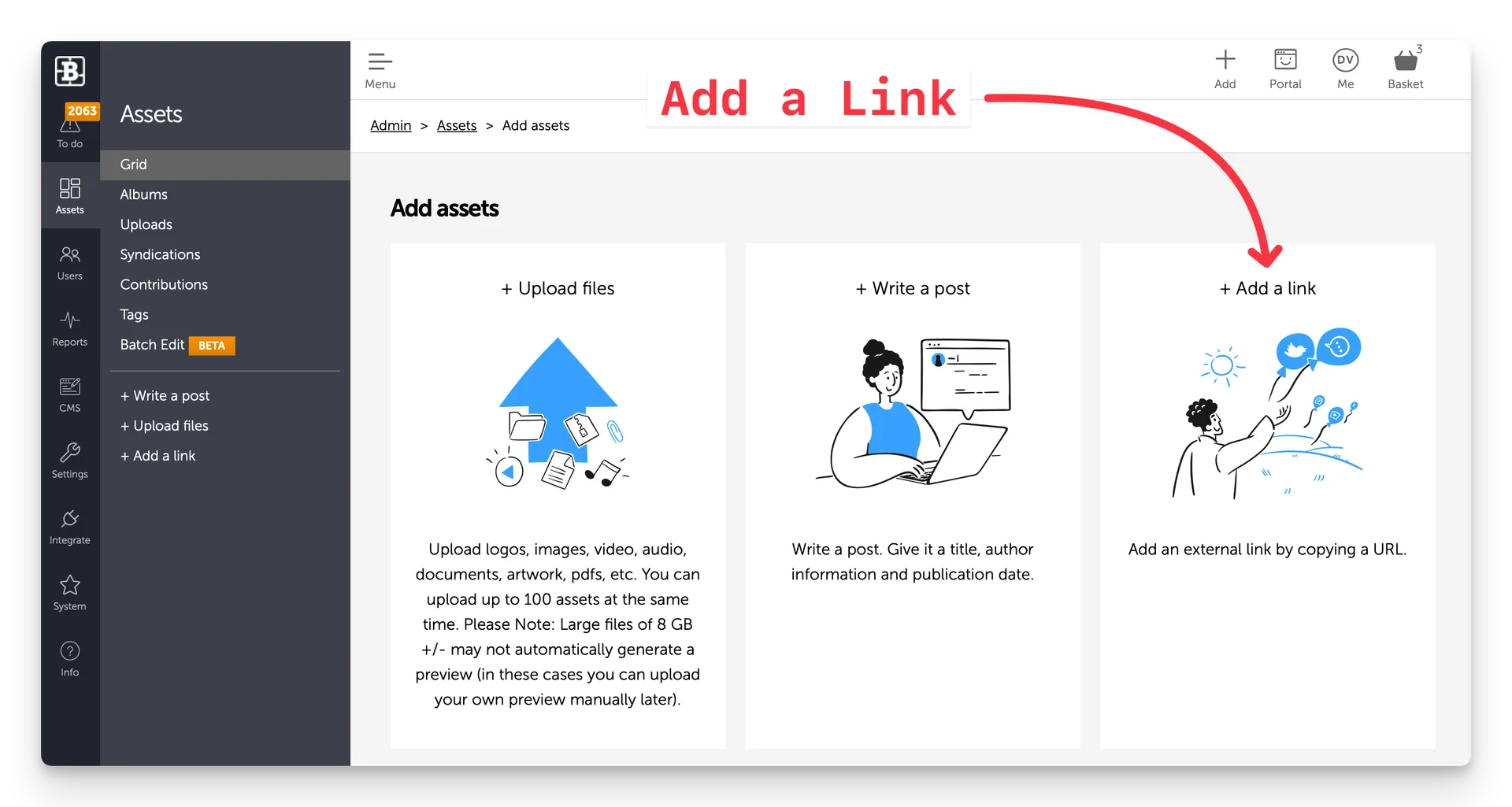 In your Brandkit navigate to the Admin area, and click the Add (+) button in the top right menu, and then select the Add a Link option.